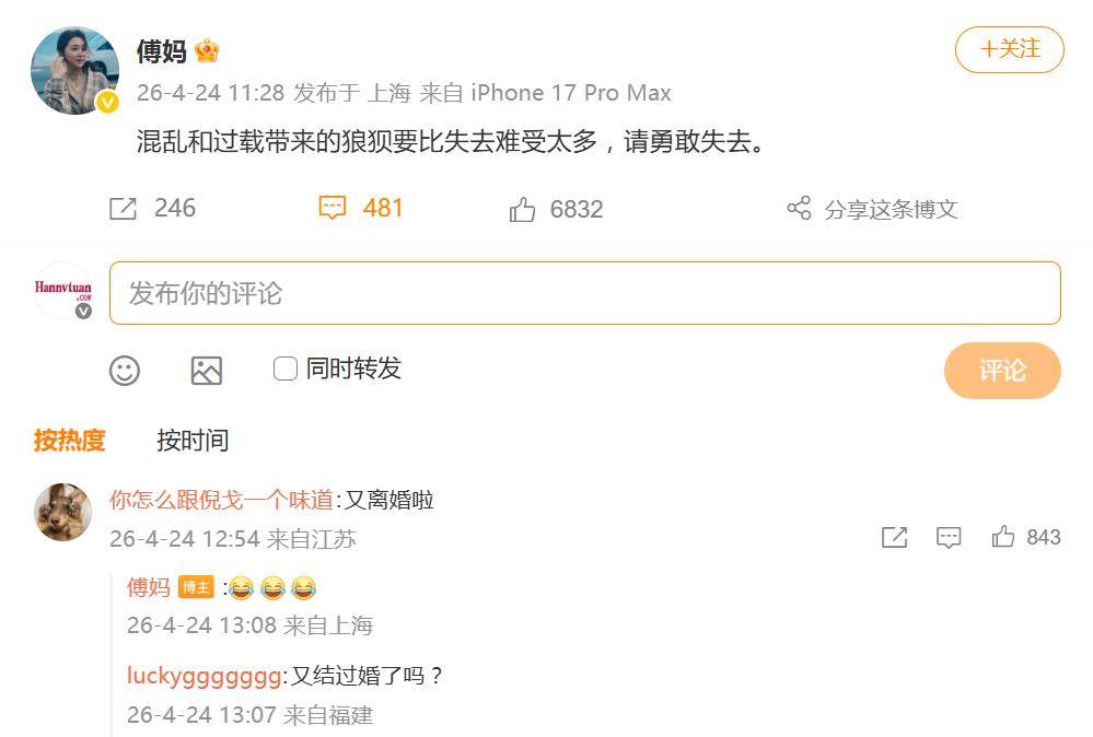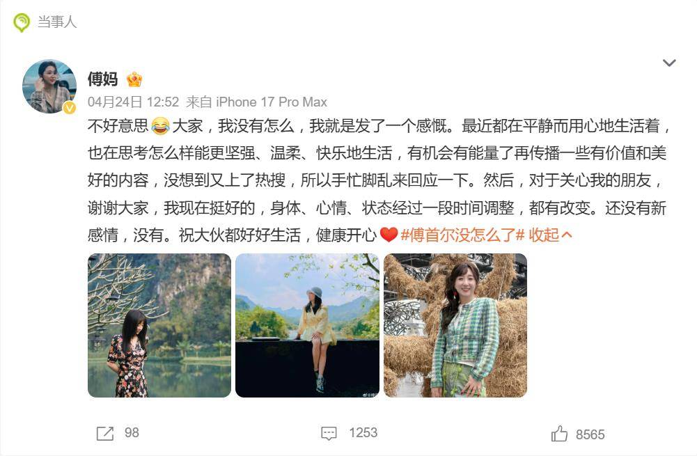 事情是这样的。24日,傅首尔先是在社交平台上发了一句让人浮想联翩的话:“混乱和过载带来的狼狈要比失去难受太多,请勇敢失去。”这话一出,评论区立马炸了,不少人开始猜测:这是不是暗示有新恋情了?还是走出来了?